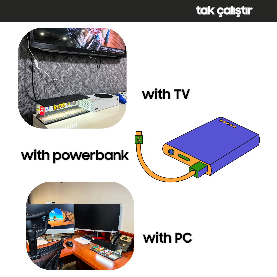 Pil derdi yok! USB kablo ile powerbank, TV veya bilgisayara bağlayarak hemen kullanmaya başlayabilirsiniz. Aç/kapa tuşu ile pratik kullanım sağlar.